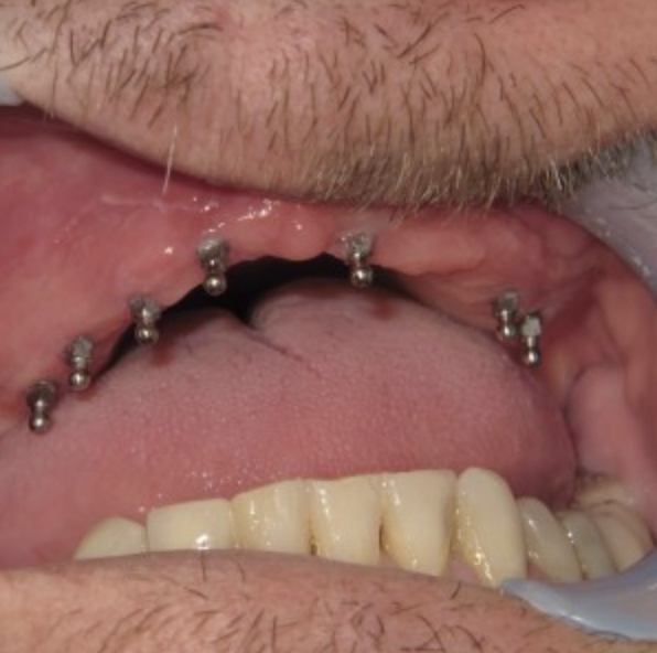 Similar to the Fix on Six this is a patient that has a hybrid denture. The patient has all their top teeth missing. The denture is fabricated around metal framework that have holes where the implants are permanently cemented to create a permanent acrylic bridge. The cost of this procedure is usually affordable by all which makes a great permanent solution for a patient that can not afford a porcelain or zirconia roundhouse.o.