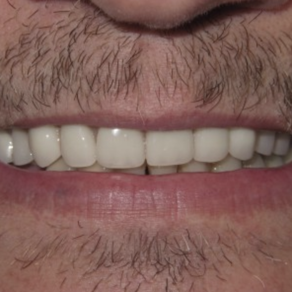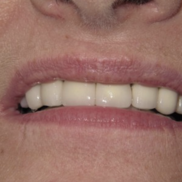 A ceramic roundhouse was used to replace this patients smile. With a roundhouse about 10 to 14 mini implants are used to permanently fix a ceramic or zirconia roundhouse. The roundhouse gives the patient the most natural smile with ceramic teeth. The patient can use his teeth just as they would if they were their own. The ceramic roundhouse is by far the most natural looking and feeling option to replace an indentureless smile.