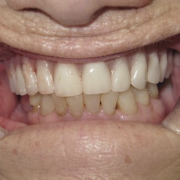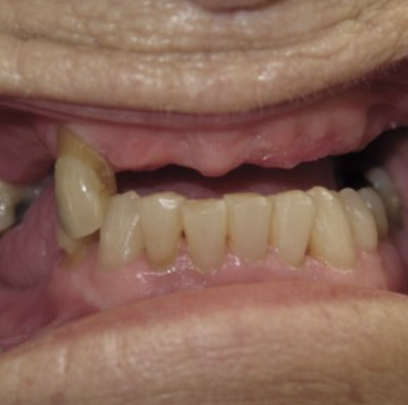 Sometimes an upper and lower denture can be loose and uncomfortable. In this case both the upper and lower dentures were stabilized to create a beautiful outcome. The denture is easier to wear and sore spots heal.